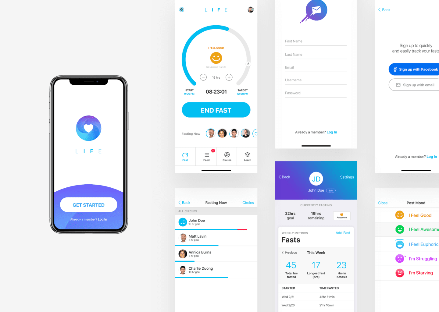 As product design lead, I designed LIFE Fasting Tracker from the ground up: the interaction model, visual identity, onboarding experience, real-time tracking interface, and the social "Circles" feature that became one of the app's defining differentiators. Within months of launch it became one of the top-rated health apps in the App Store, accumulating 4 million downloads, a 4.8 star rating, and earning 3 design patents.