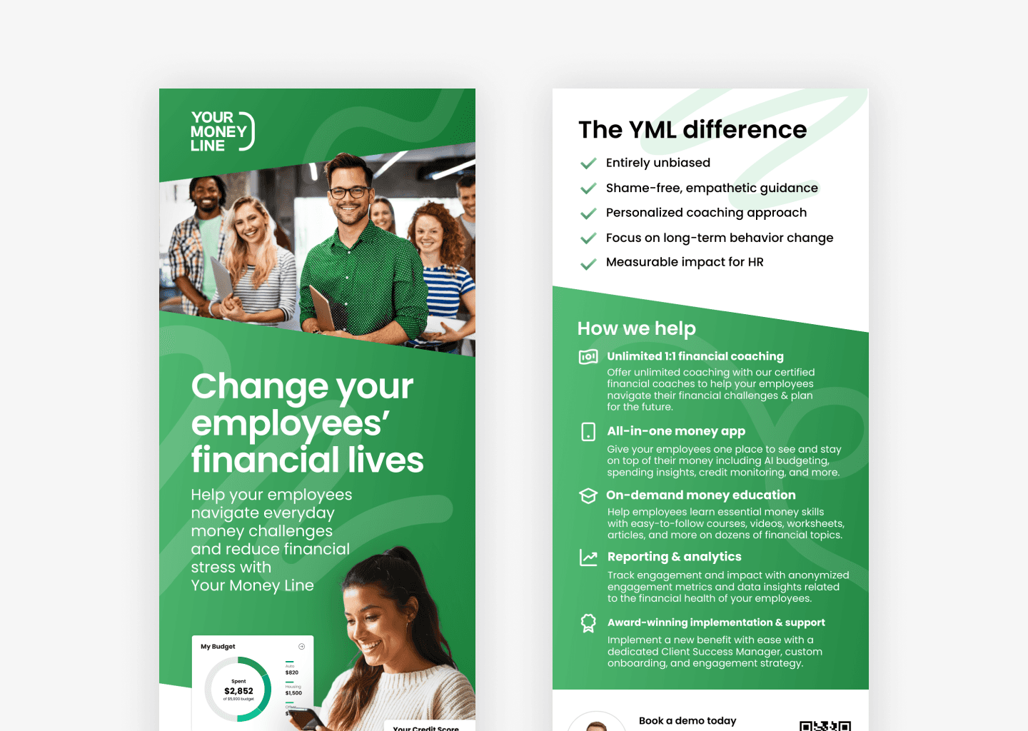 Your Money Line supports employees with practical financial guidance and tools. This is an ongoing client relationship spanning four years, covering brand, marketing, and campaign design across the full range of touchpoints - landing pages, website, decks, social assets, and video.